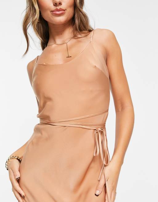 Asos Design Scoop Neck Satin Midi Slip Dress With Tie Waist Detail In Tan Asos